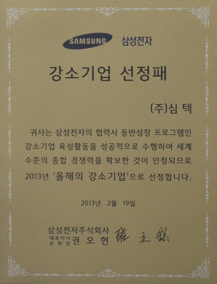 (주)심텍은 삼성전자로 부터 '2013년도 강소기업'으로 선정되었습니다.