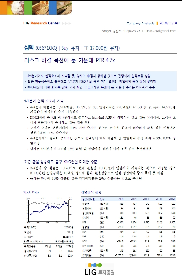 리스크 해결 목전에 둔 가운데 PER 4.7x - LIG투자증권
